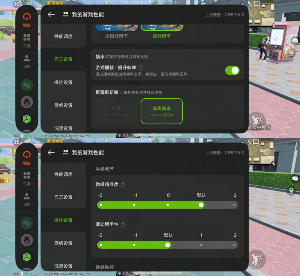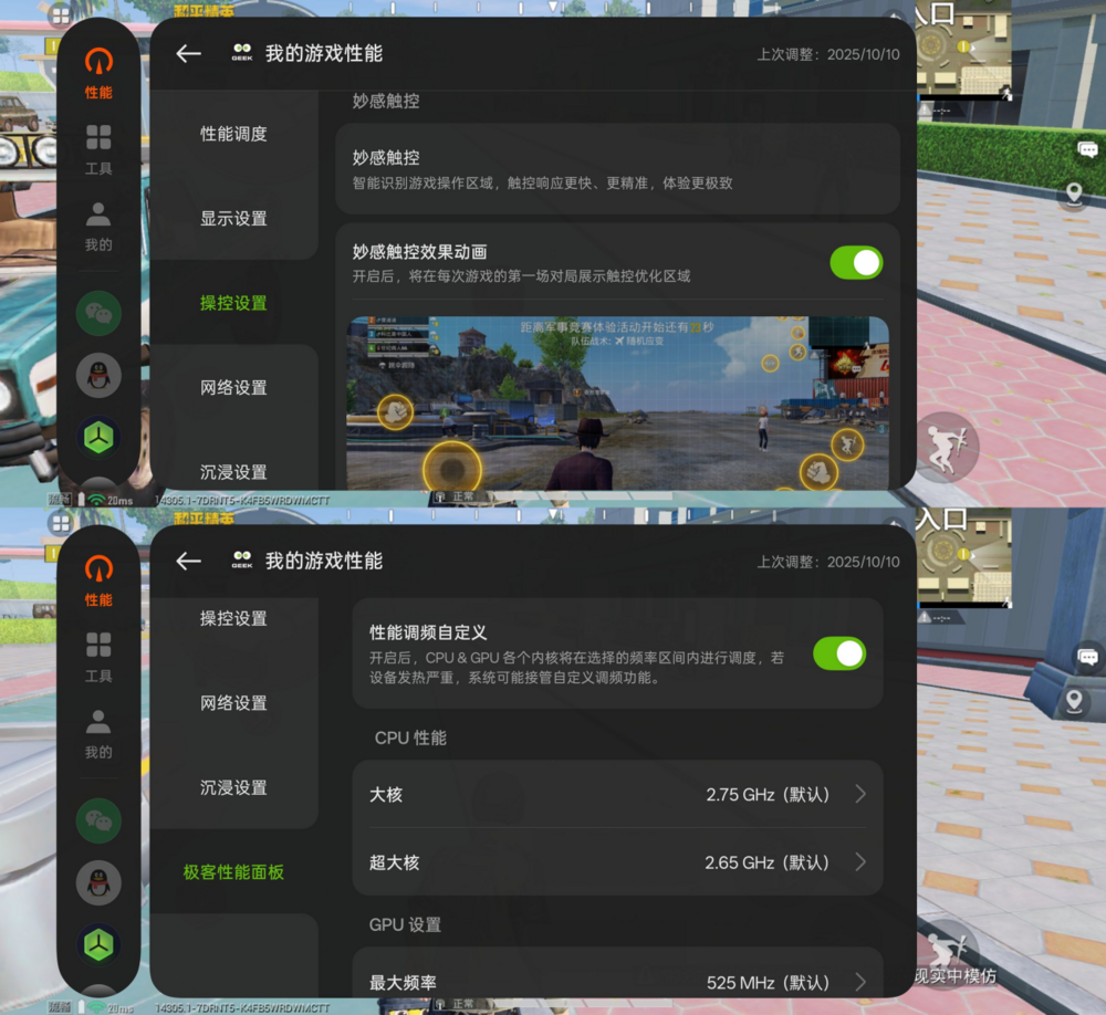 加上超高的瞬时触控采样,玩家还可以自己调节灵敏度,而妙感触控芯也是可以进一步优化触控区域,提升操作,极客面板更是允许用户自己调节CPU的运行频率。