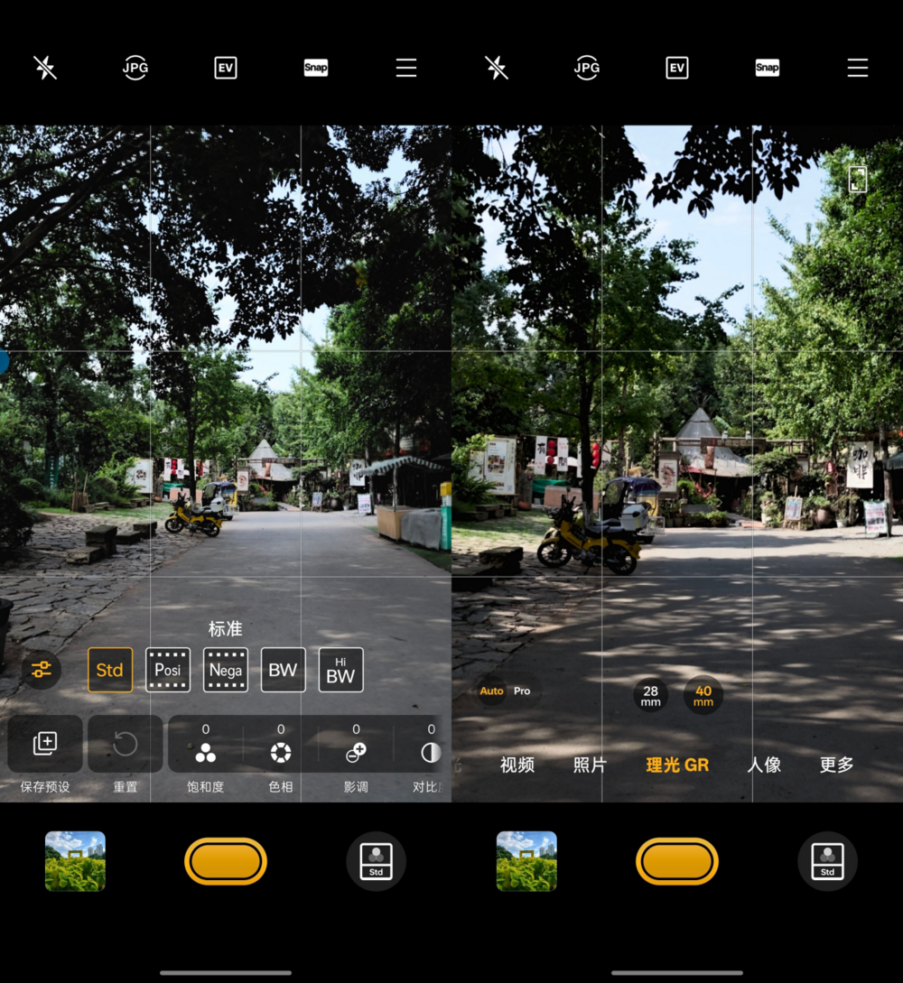 而理光GR模式则是非常适合街拍的,它的五大经典胶片影调,标准、正片、负片、高对比黑白、以及单色都能拍出一股“相机”的味道,主打一个氛围感,两个焦段可以随意进行影调的调节,而且GR模式拍的照片可以自动归纳为理光GR的专属相册,相机的算法引擎进行深度的经典复刻加上理光GR防眩光主摄可以真实的还原光影。